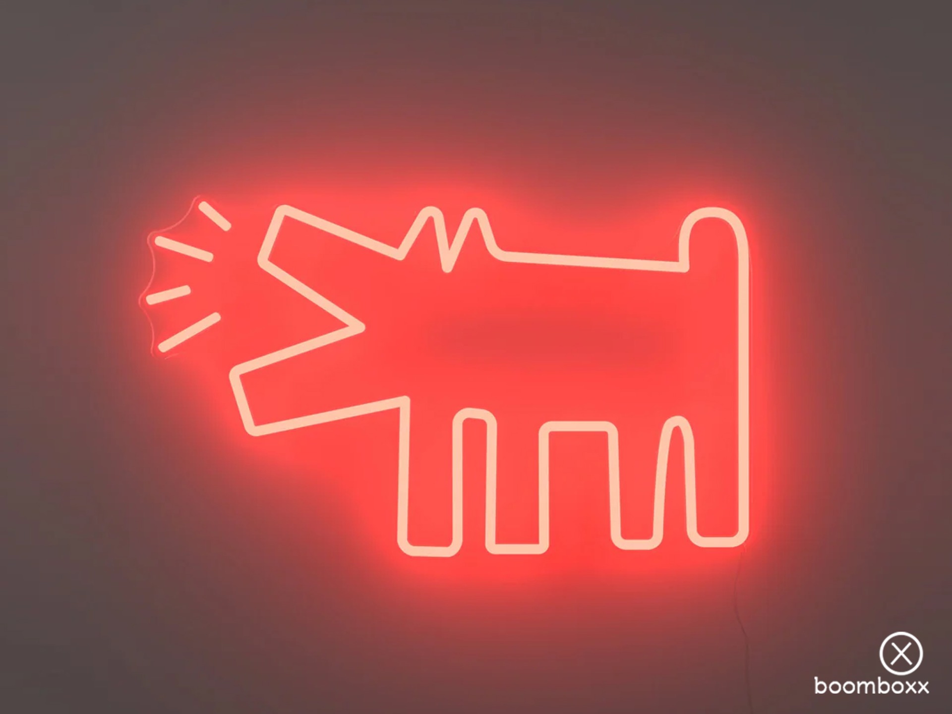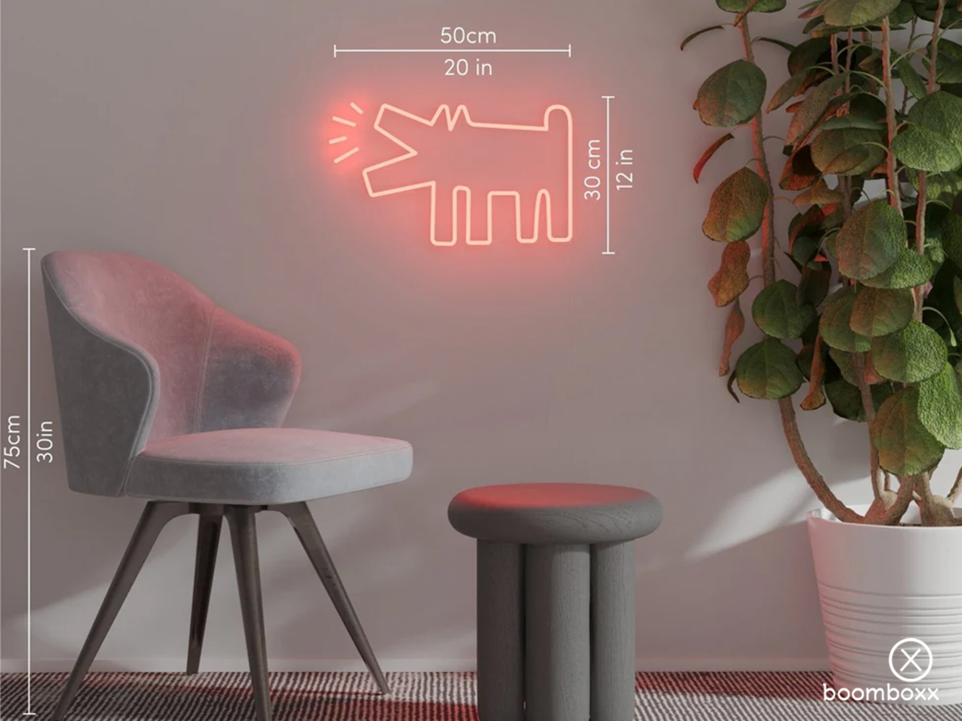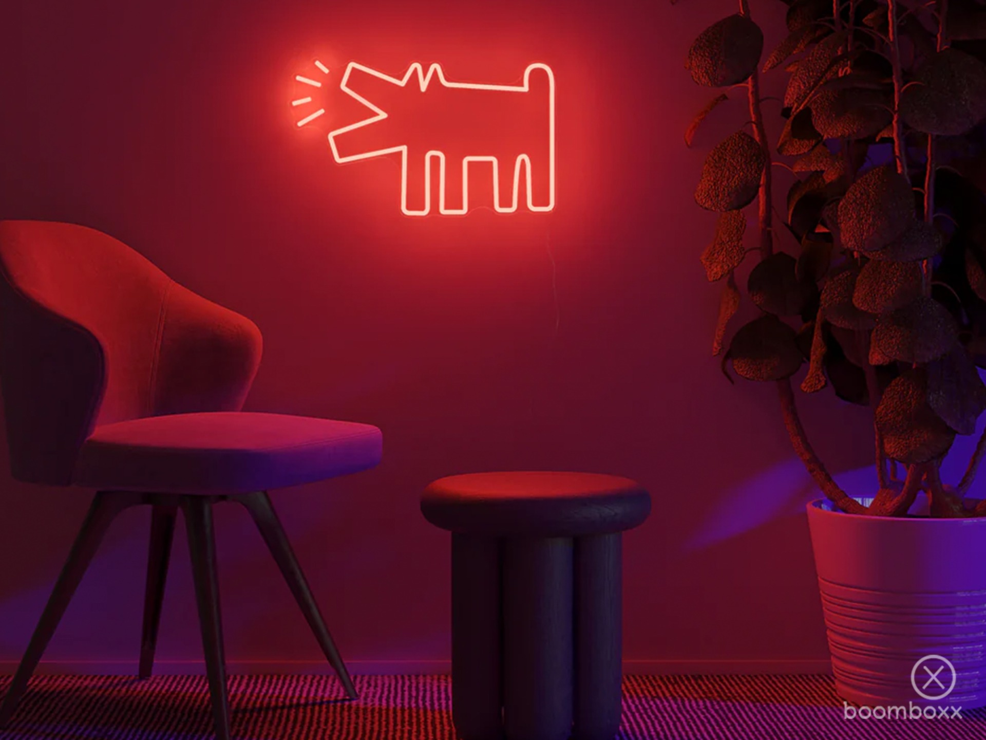 Barking Dog x Keith Haring YP. Dit neon-ledwerk herinterpreteert een van Keith Harings kleurrijke, geanimeerde iconen en transformeert het in een uniek kunstwerk voor thuis. Barking Dog is exclusief ontworpen voor de samenwerking tussen Yellowpop en Keith Haring en bestaat uit ledlampjes die sterker, aanpasbaar of volledig uitgezet kunnen worden – zoals geen enkele blaffende hond.