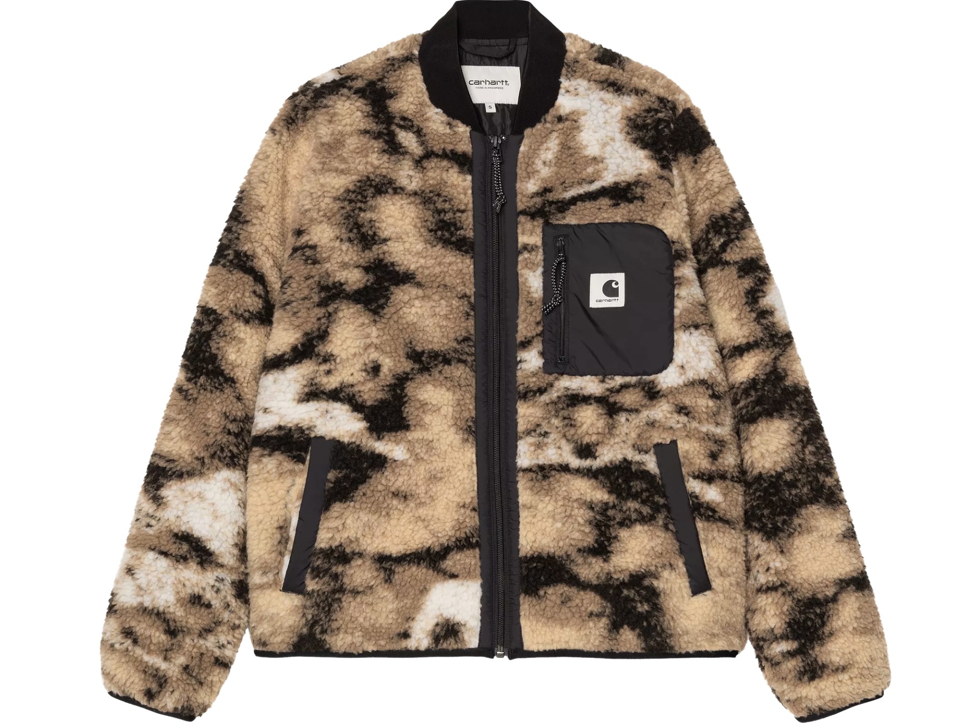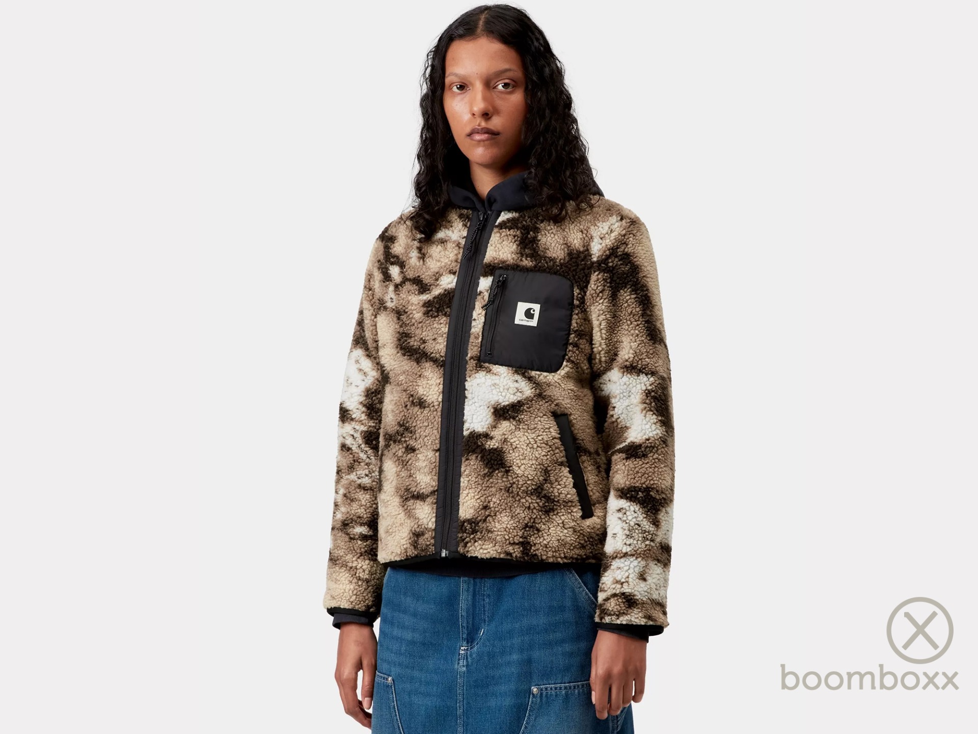 CARHARTT WIP W Janet Liner Wild Dog Jacquard Black. De Women’s Janet Liner is een middelzware fleece van 100% polyester teddy en is voor meer warmte en bewegingsvrijheid gevoerd met nylon tafzijde. De voering heeft ook details van nylon tafzijde, een ribgebreide kraag en een contrasterende borstzak met het klassieke Carhartt WIP logo. Regular fit.