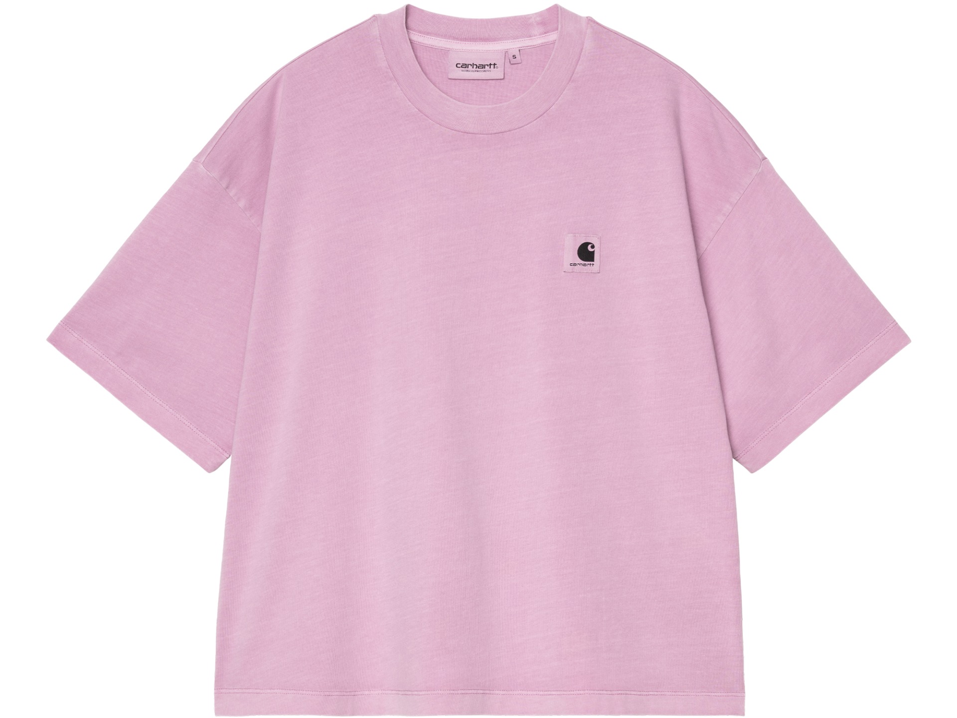 Carhartt Wip W Nelson T-Shirt Gentle Purple. Het S/S Nelson T-Shirt voor dames is gemaakt van lichte katoenjersey en heeft een loose fit en een iets korter silhouet. Het item is ook garment-dyed voor een zachtere feel en een complexe kleurstelling. Links op de borst bevindt zich een geweven Square Label, dat er door het verfproces wat vervaagd uitziet.