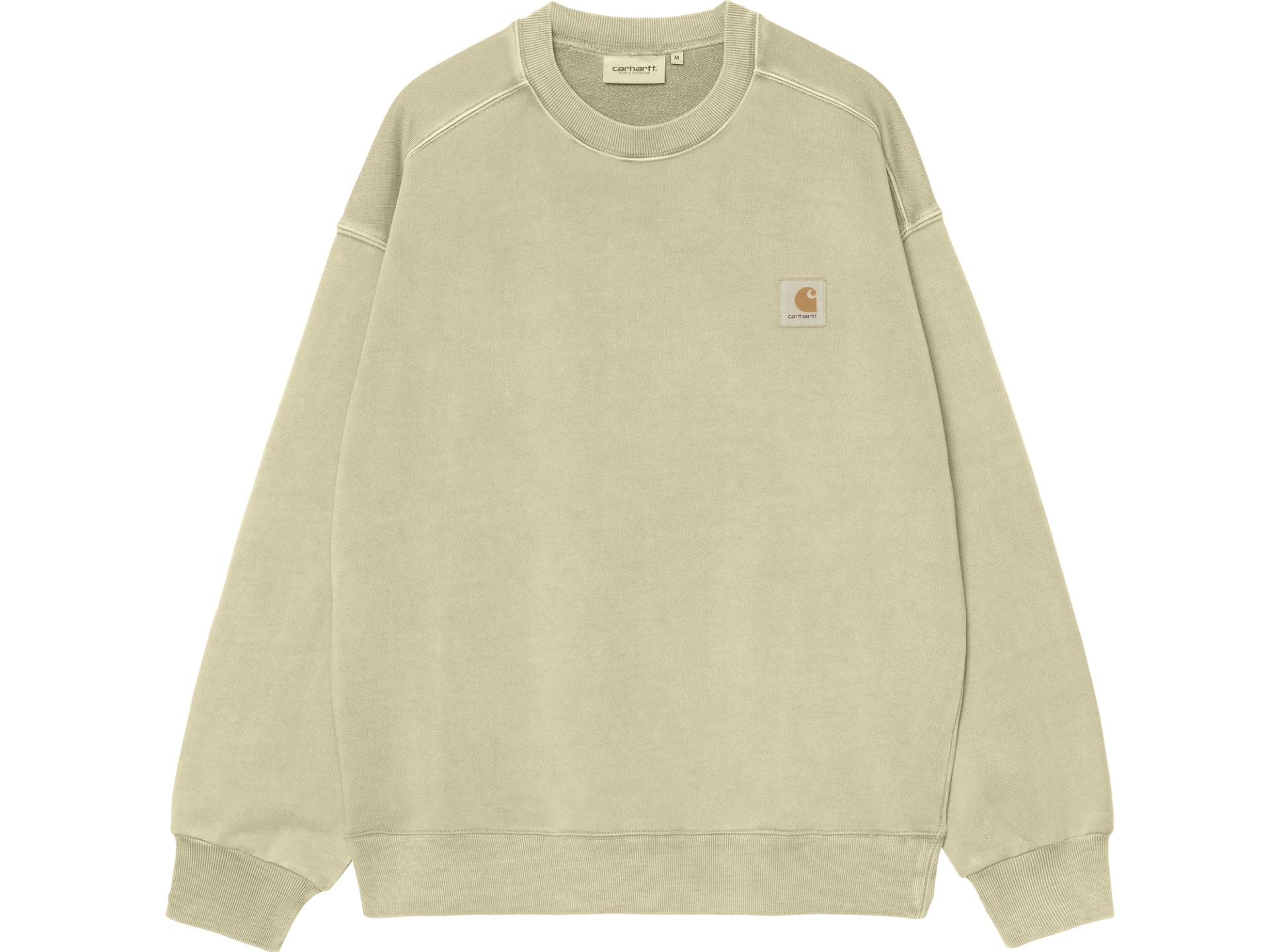 Carhartt Wip Nelson Sweat Gentle Green. Het Nelson Sweatshirt is gemaakt van zware, ongeborstelde katoenjersey met een tactiele loopback-constructie. Het item heeft een balloon fit, die iets losser en breder valt, maar wordt ook gekenmerkt door verlaagde schouders en geribde randen. Het model heeft ook een garment-dye behandeling gekregen voor een gewassen maar verzadigde kleur en een zachtere feel. Links op de borst bevindt zich een geweven Square Label van Carhartt wip, dat er door het garment-dyeing proces wat vervaagd uitziet.