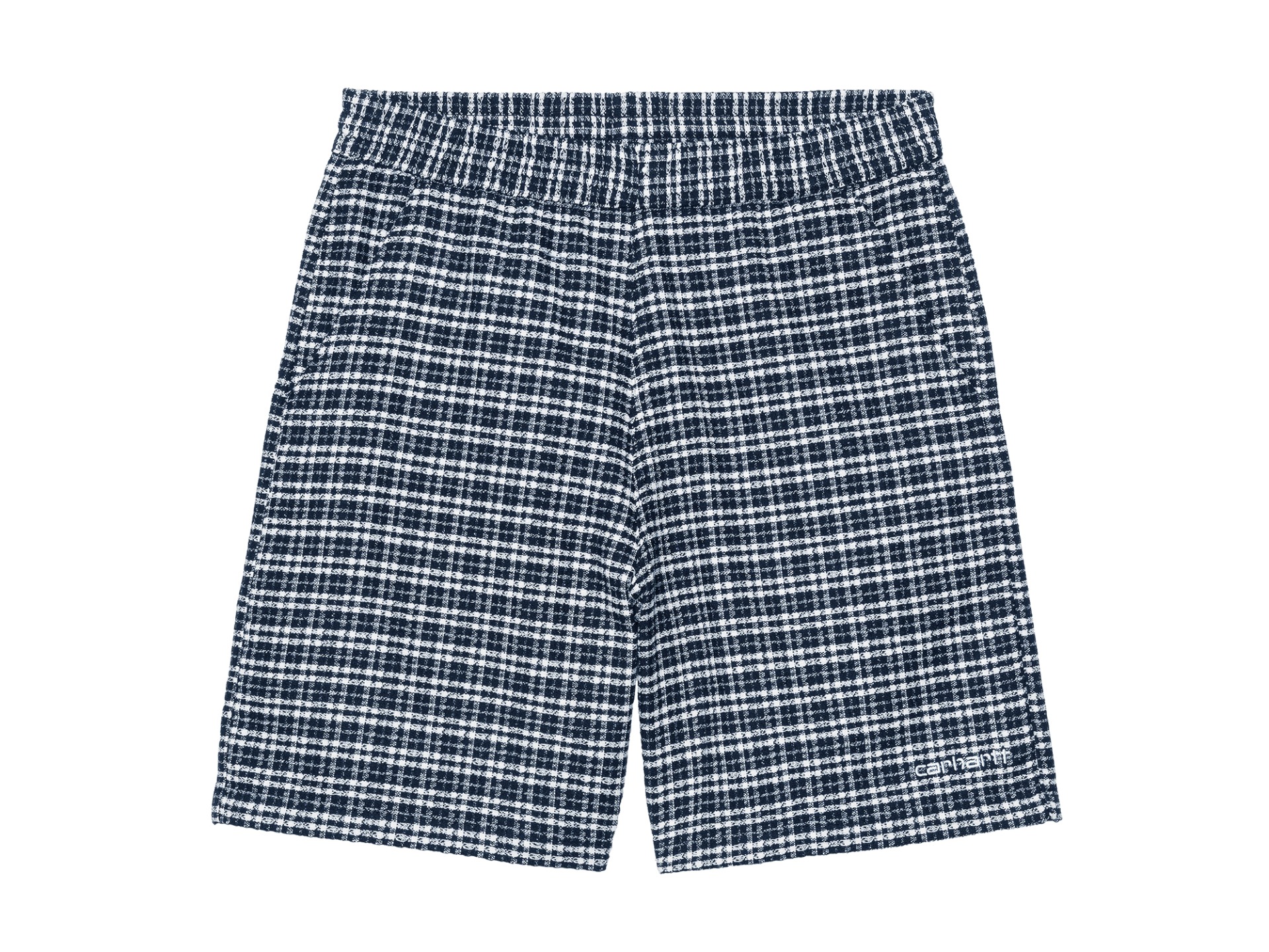 Carhartt WIP Kander Short Check Blue River. De Kander Short is gemaakt van middelzware, getextureerde katoenen wafelstof, die garment-washed is voor een zachtere feel. De short heeft bovendien een met een koord verstelbare, elastische tailleband. Twee zakken bevinden zich aan de voorkant, en er is één zak op de achterkant. Een geborduurd Script logo maakt het ontwerp helemaal af.
