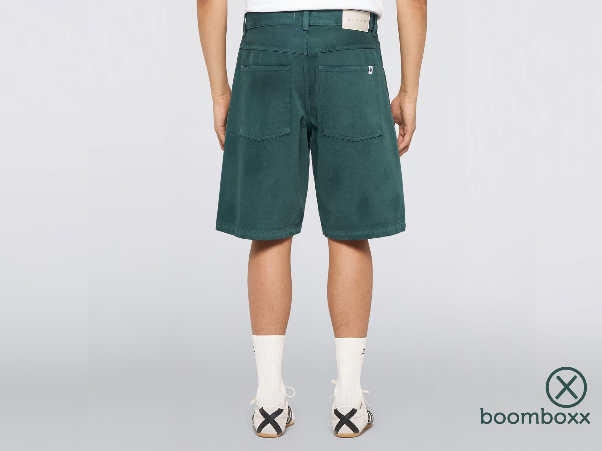 Edwin Worker Short Blue Emerald. De Worker Short heeft een losse pasvorm en is gemaakt van 14,6 oz Arctic Blue denim, afgewerkt met een unieke Emerald Overdyed-behandeling. De short is voorzien van een praktische ritssluiting en kenmerkende details zoals een polyurethaan patch en zilverkleurige metalen afwerkingen.