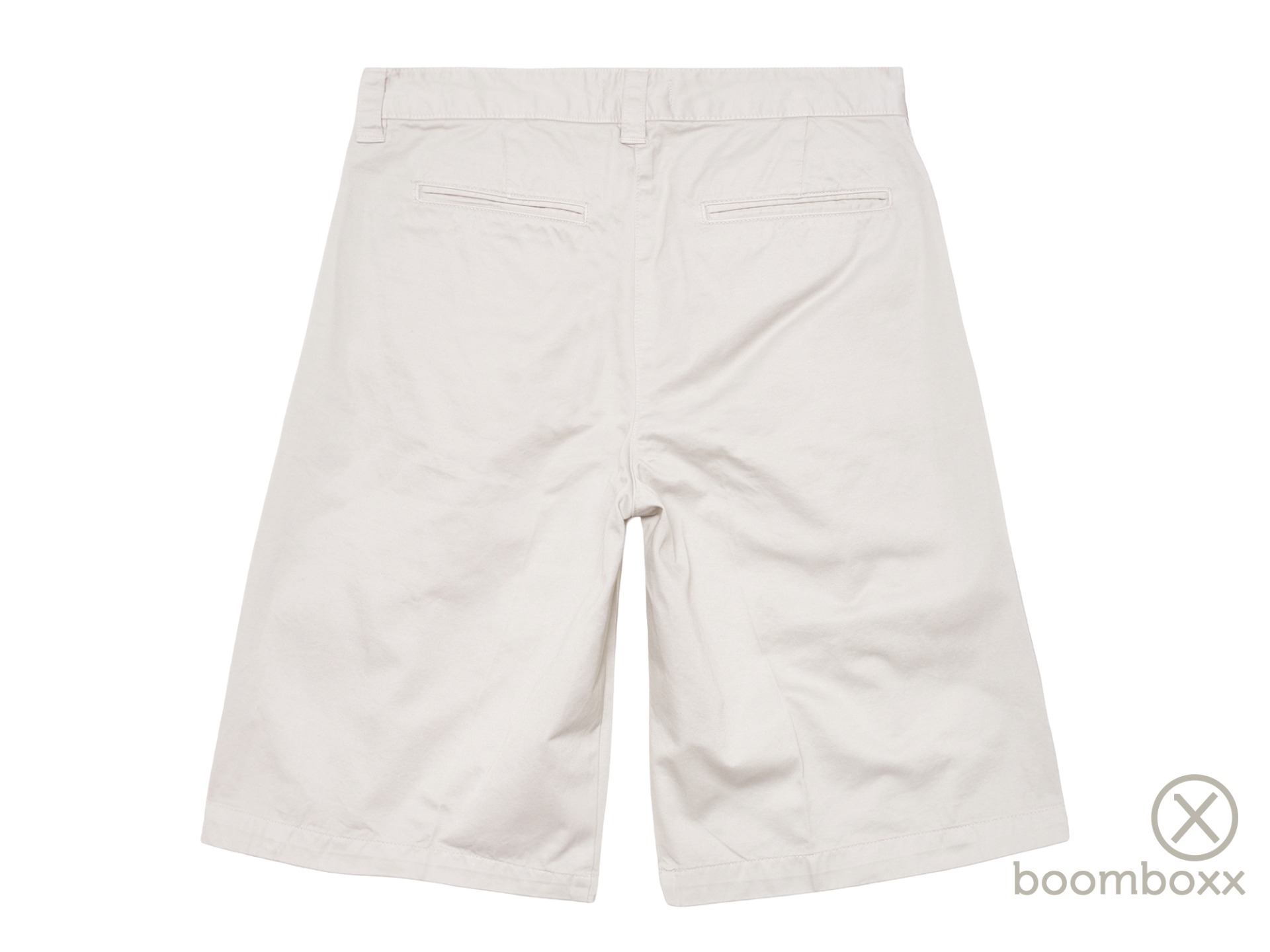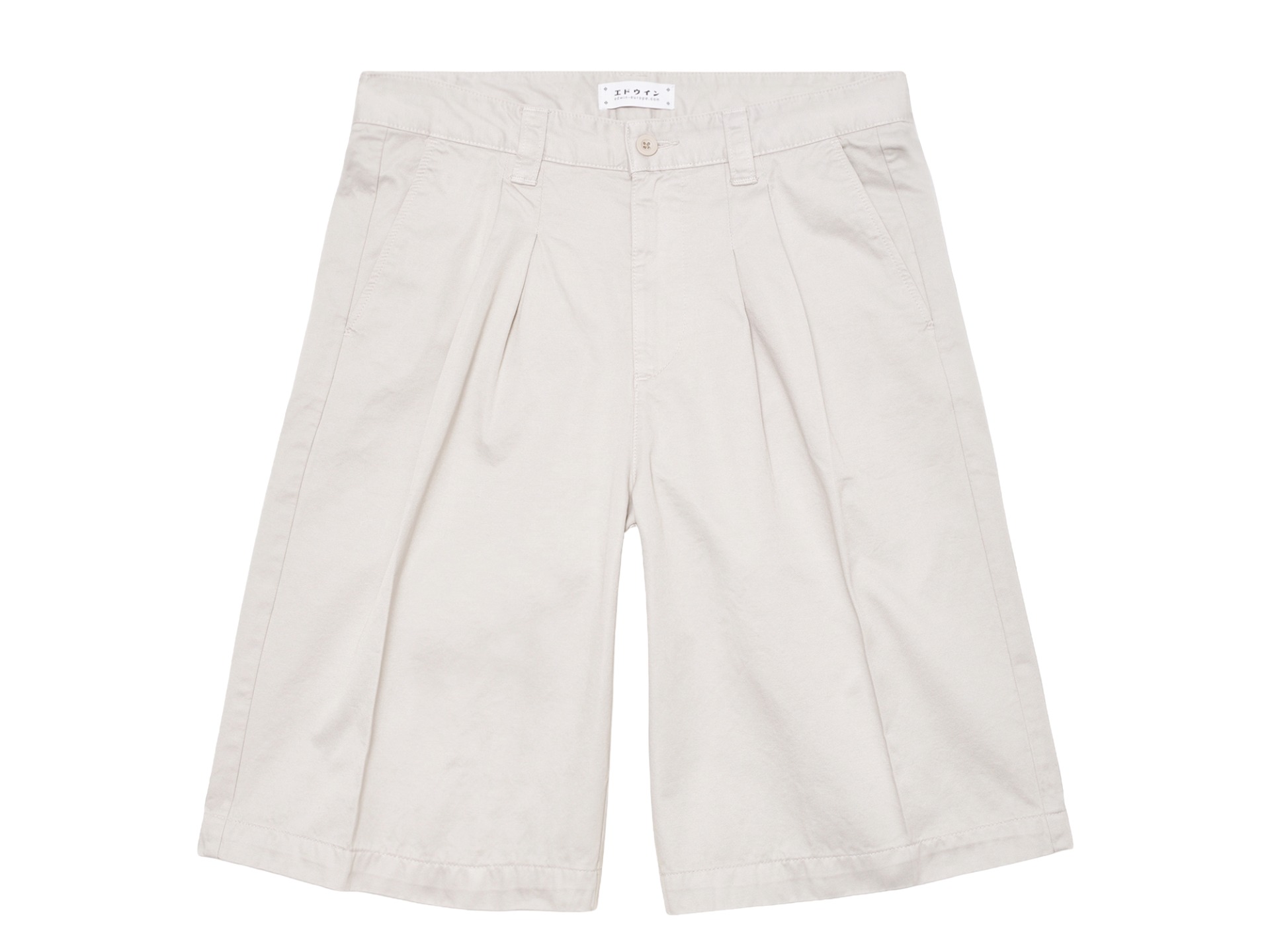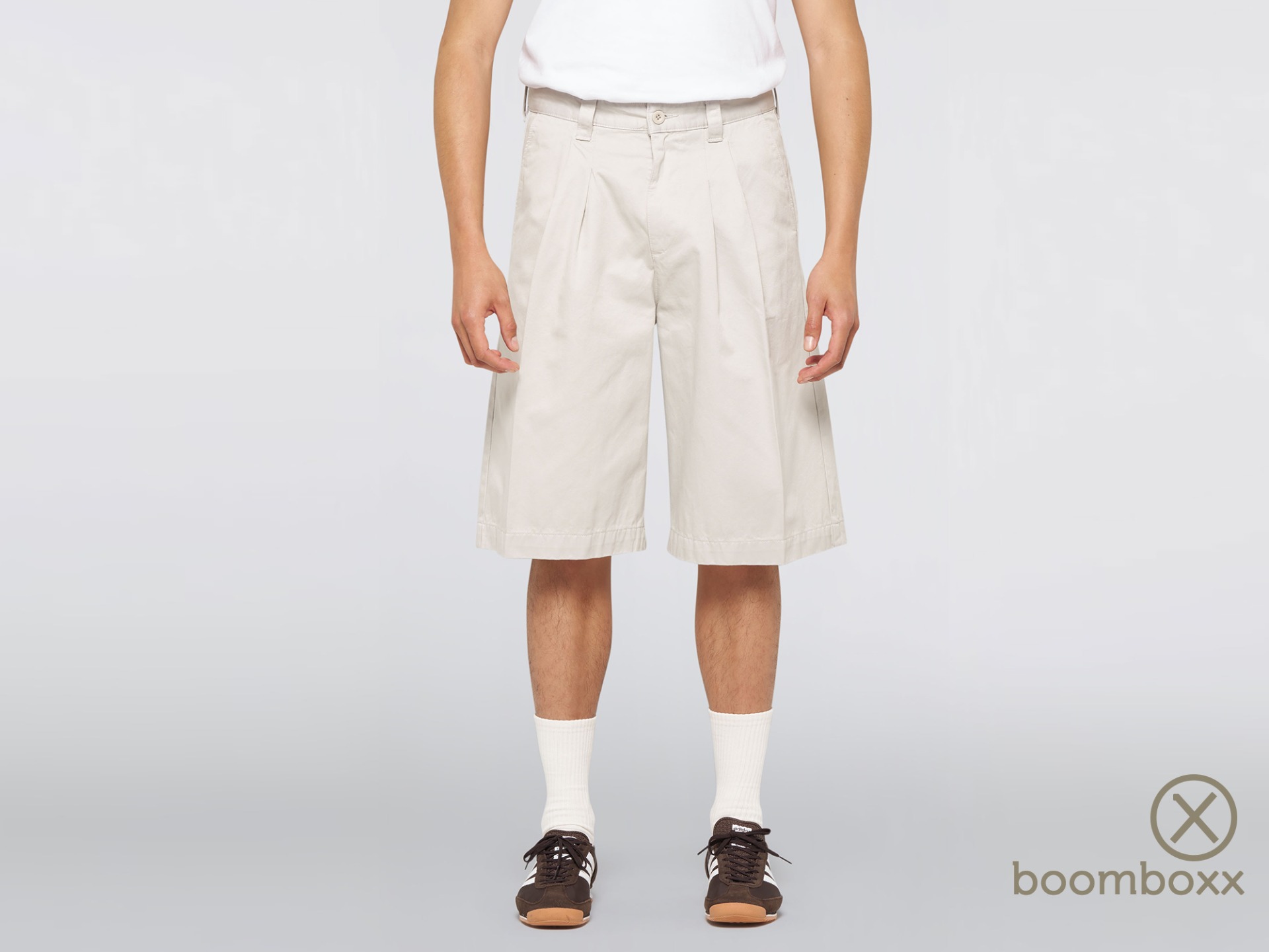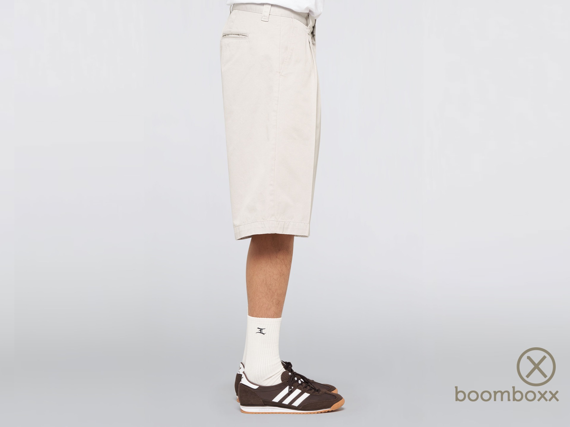 Edwin Adams Short Glacier Grey. De Adams Short, met een wijde pasvorm, is gemaakt van 10oz PFD Compact Twill in Glacier Gray voor een ontspannen gevoel, gekenmerkt door een scherpe vouw op de pijp en afgewerkt met praktische Italiaanse en met biezen afgewerkte achterzakken.