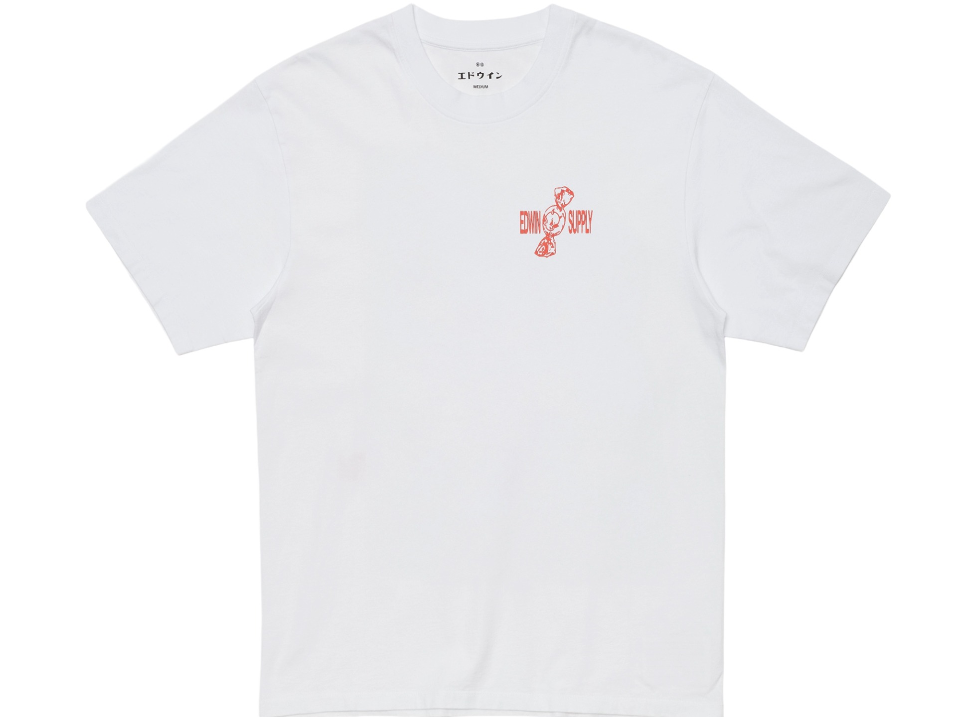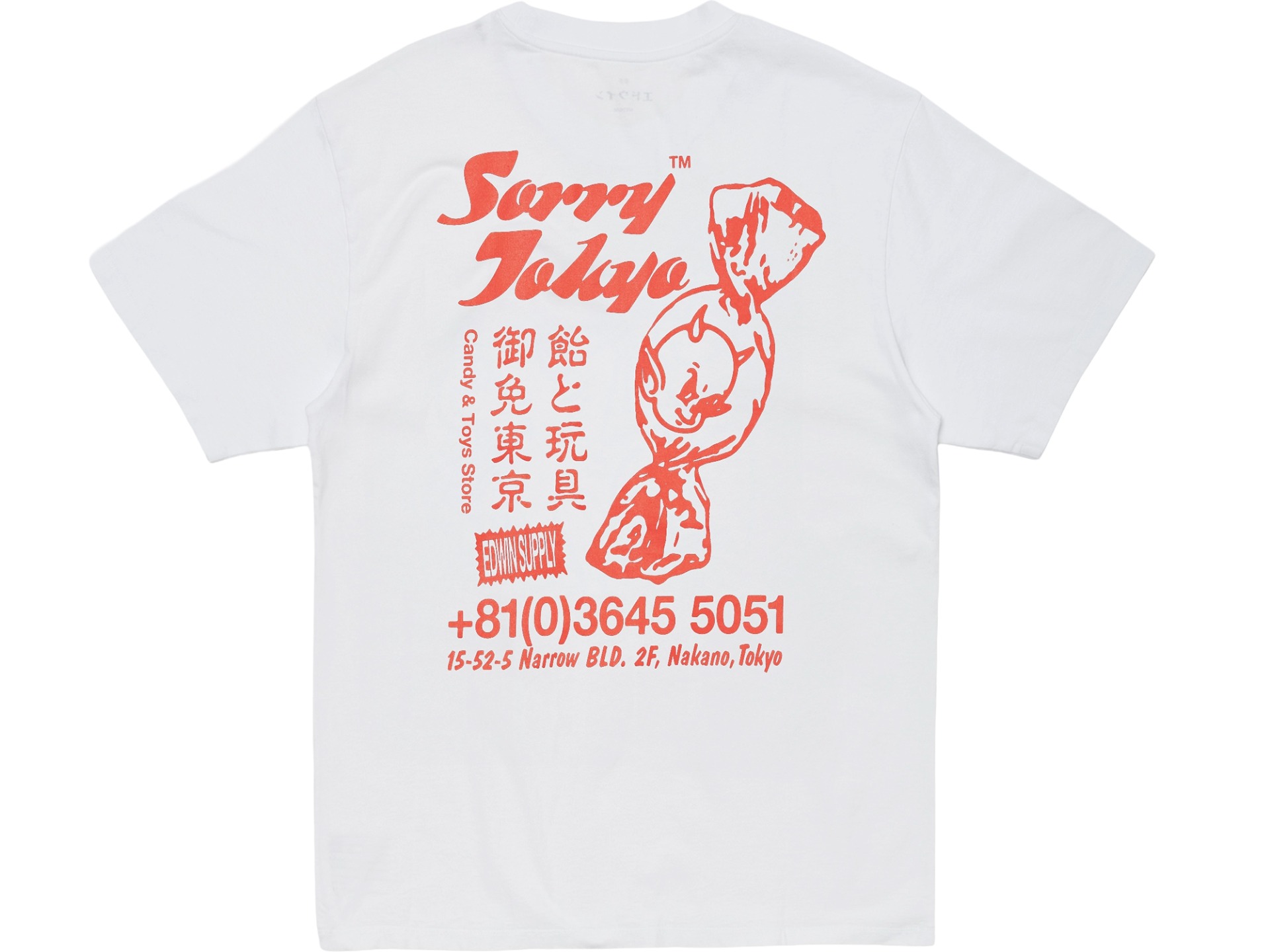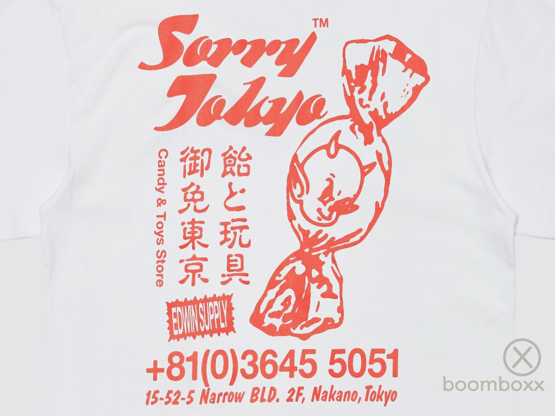 Edwin Sorry Tokyo T-Shirt White. Local Merch, geworteld in de geest van de winkeliers die Japan zo bijzonder maken, van ramenrestaurants tot ijzerwarenzaken, speelgoedwinkels tot snoepstalletjes, waar de lokale bevolking onbewust het gewone in iets bijzonders weet te veranderen.