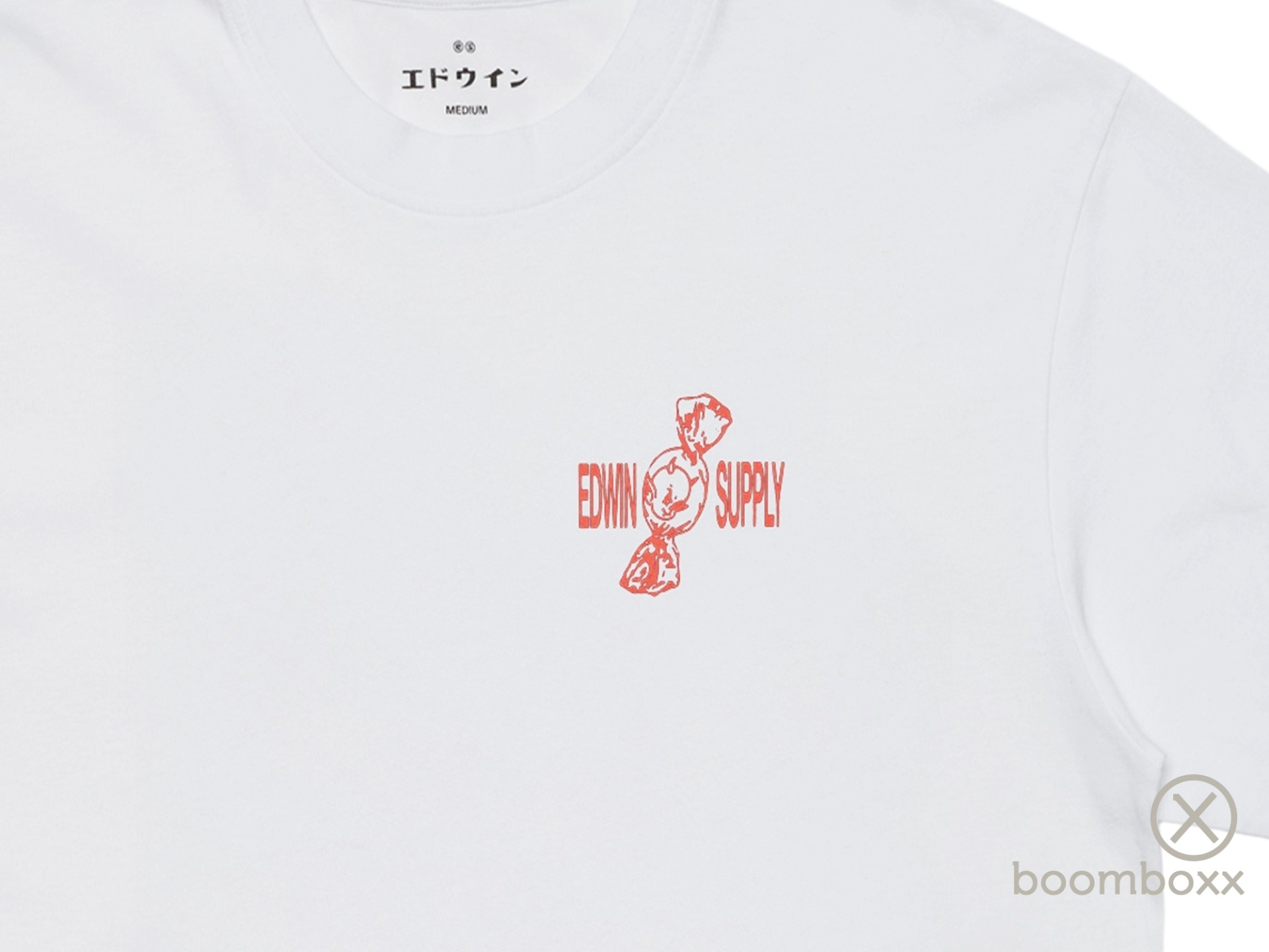 Edwin Sorry Tokyo T-Shirt White. Het Sorry Tokyo T-shirt heeft een oversized pasvorm en een geribbelde kraag. Het is voorzien van prints op de voor- en achterkant. De backprint is in het Local Merch thema, Shop lokaal bij de Boomboxx Store (Local Merch)
