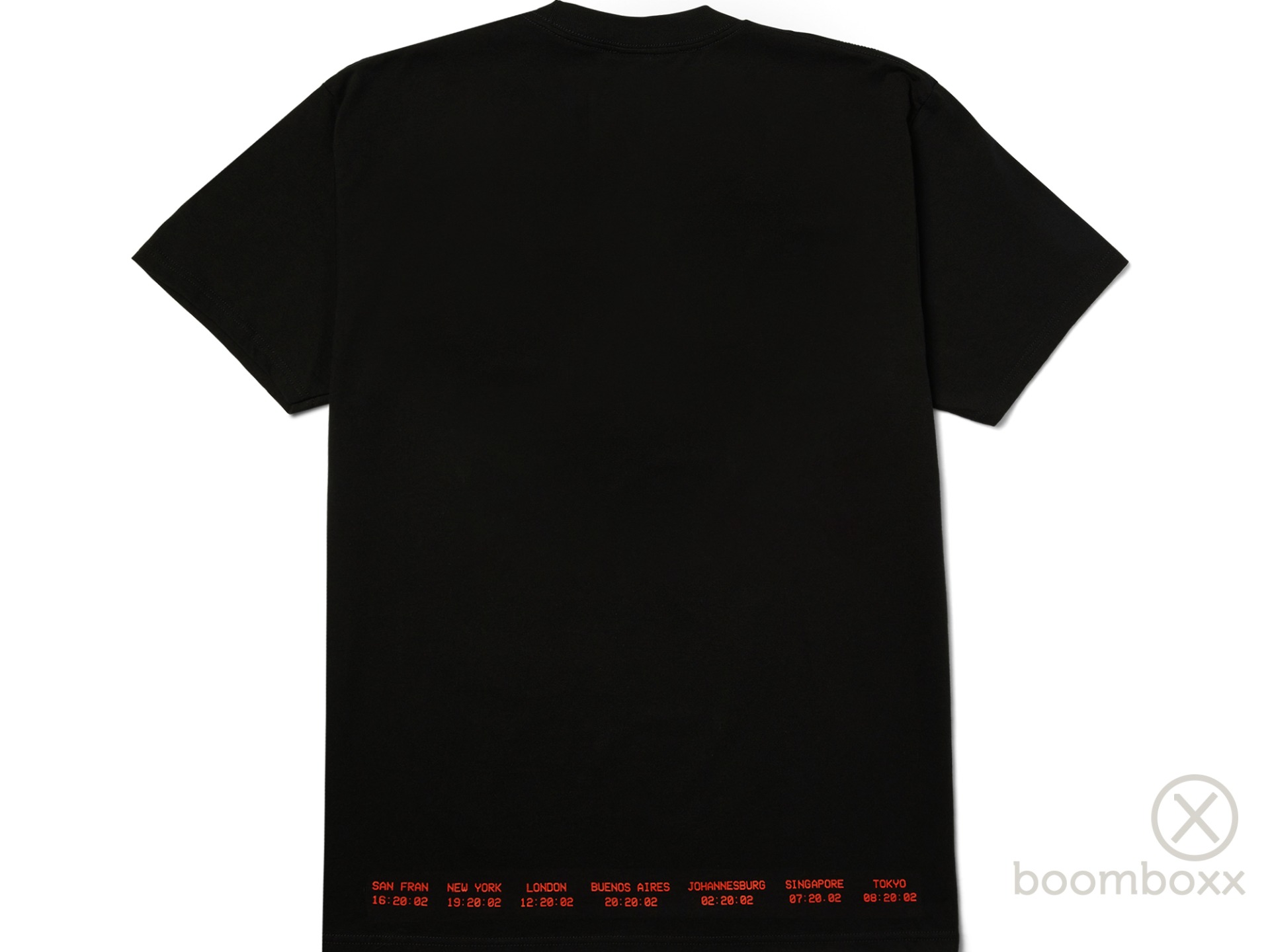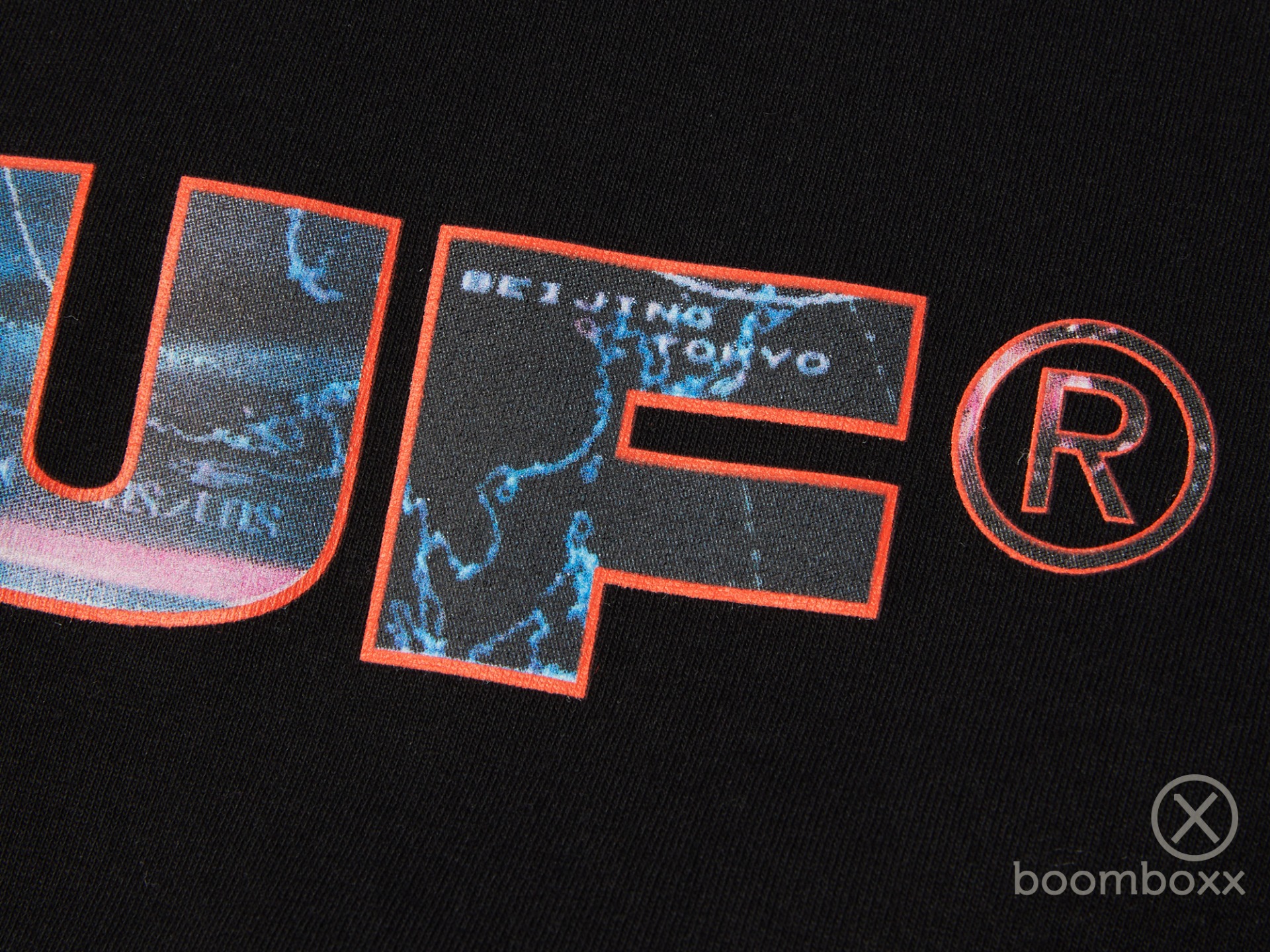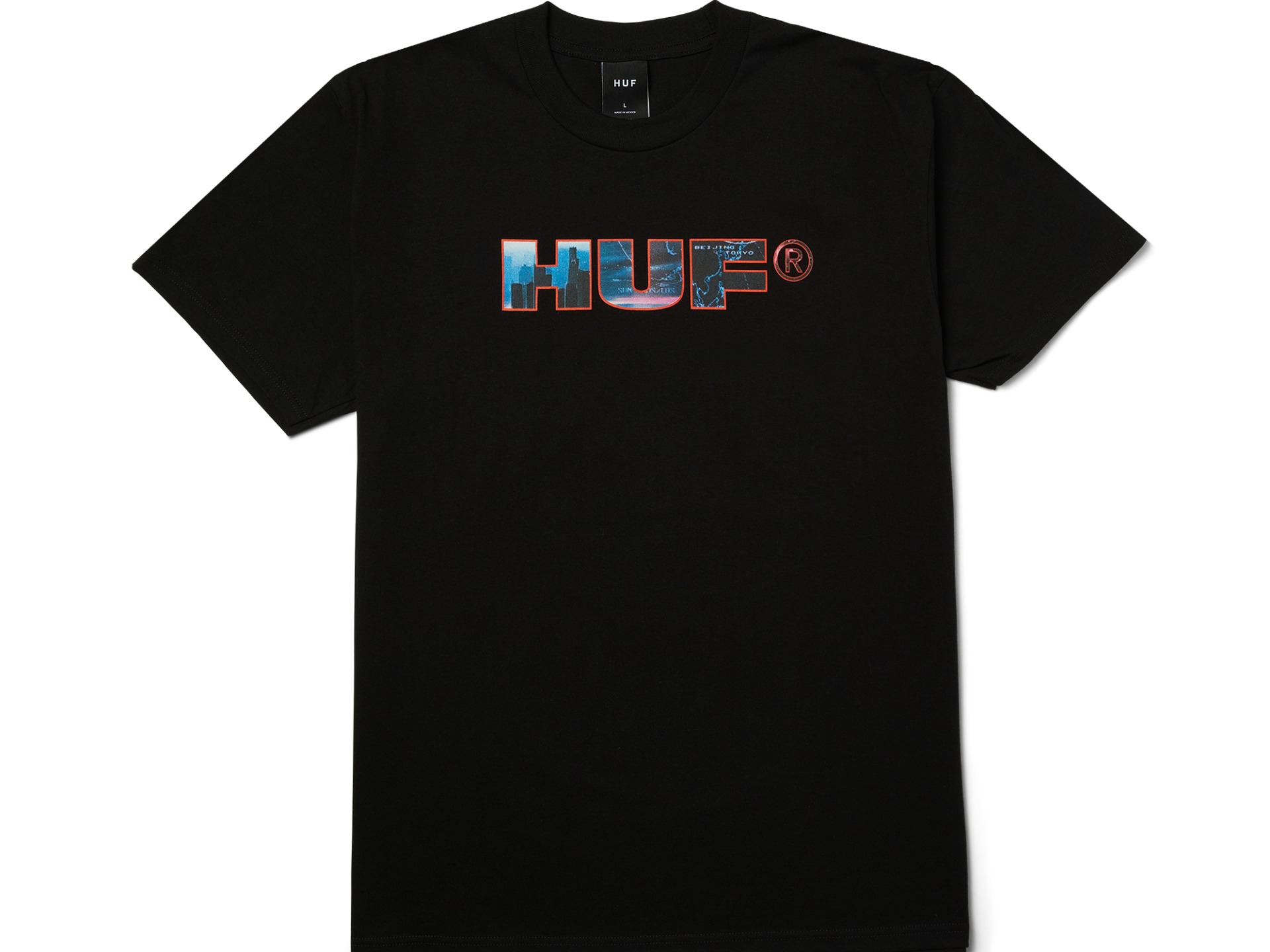 Huf Flight Patch SS T-Shirt Black. Prachtig T-Shirt met het bewerkte HUF logo op de voorkant en een zwarte cleane achterkant met wereldsteden onderaan het t-shirt.