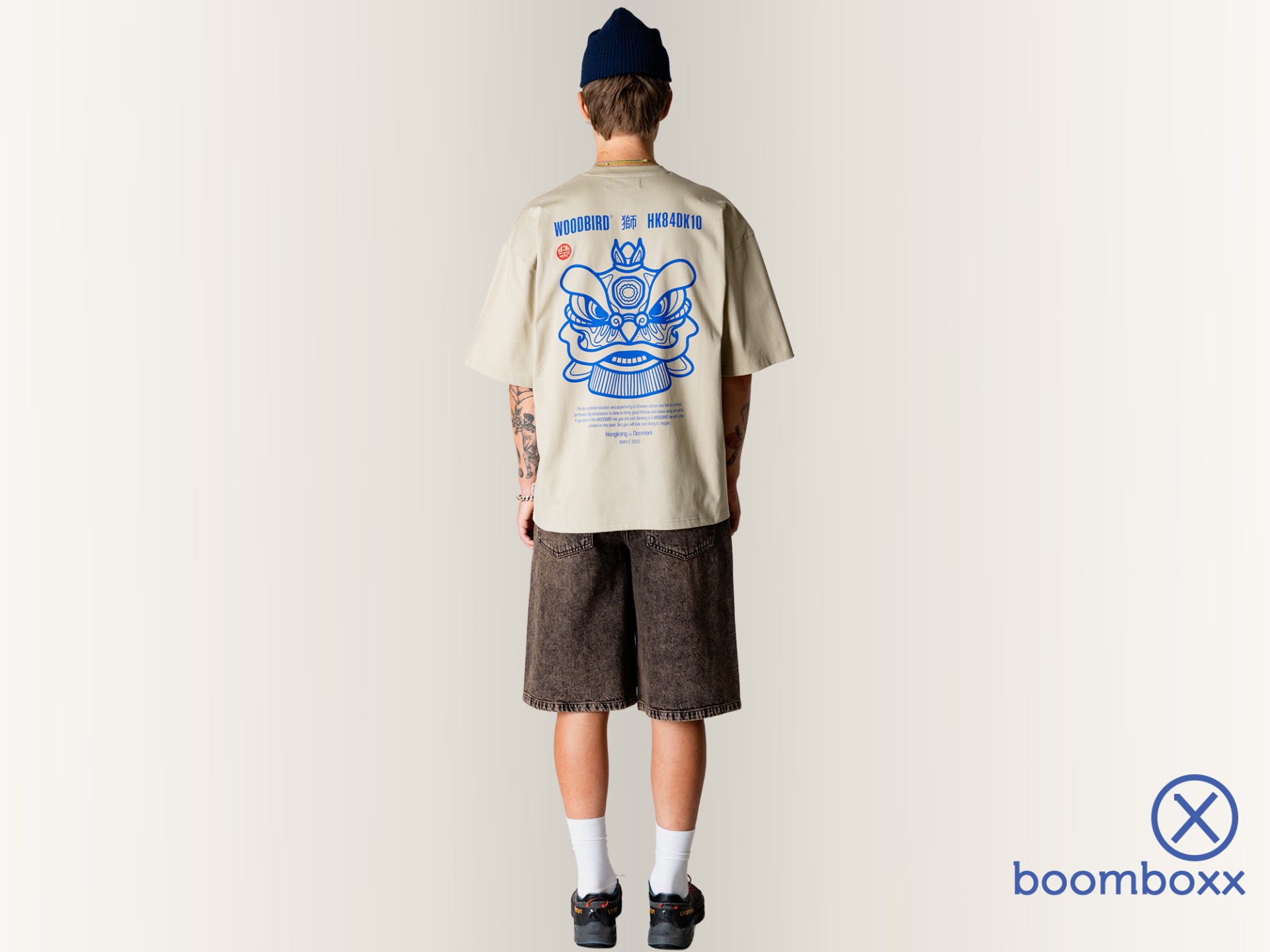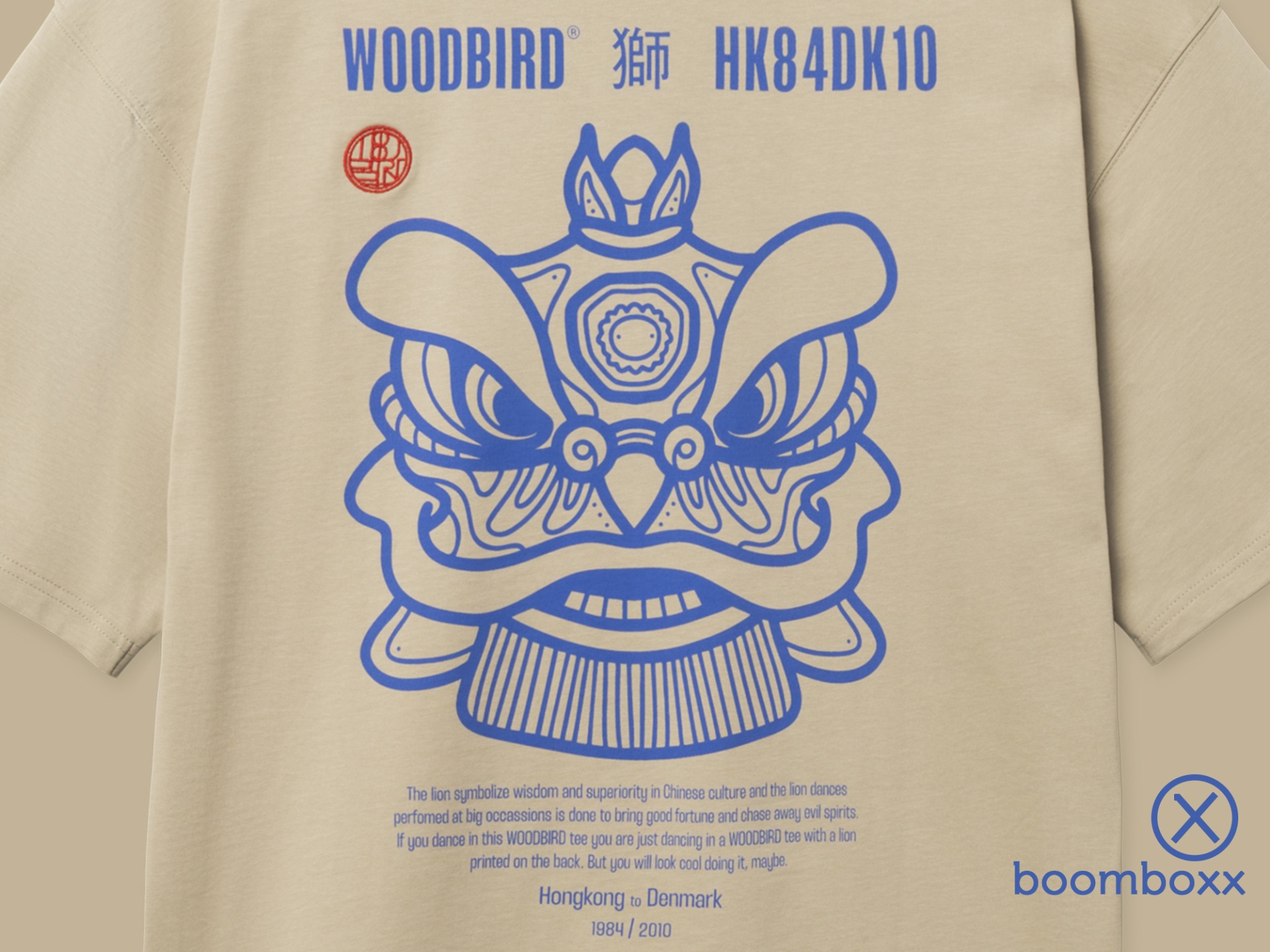Woodbird WBbeam Lion T-Shirt Stone. De leeuwendans (舞獅, wǔshī) staat in de Chinese cultuur symbool voor kracht, wijsheid en bescherming. Traditioneel wordt deze dans uitgevoerd om boze geesten te verdrijven en geluk te verwelkomen. Het woeste masker belichaamt kracht en feestelijkheid. Dit T-shirt vangt die rijke traditie en vertaalt eeuwenoude betekenis naar draagbare energie.