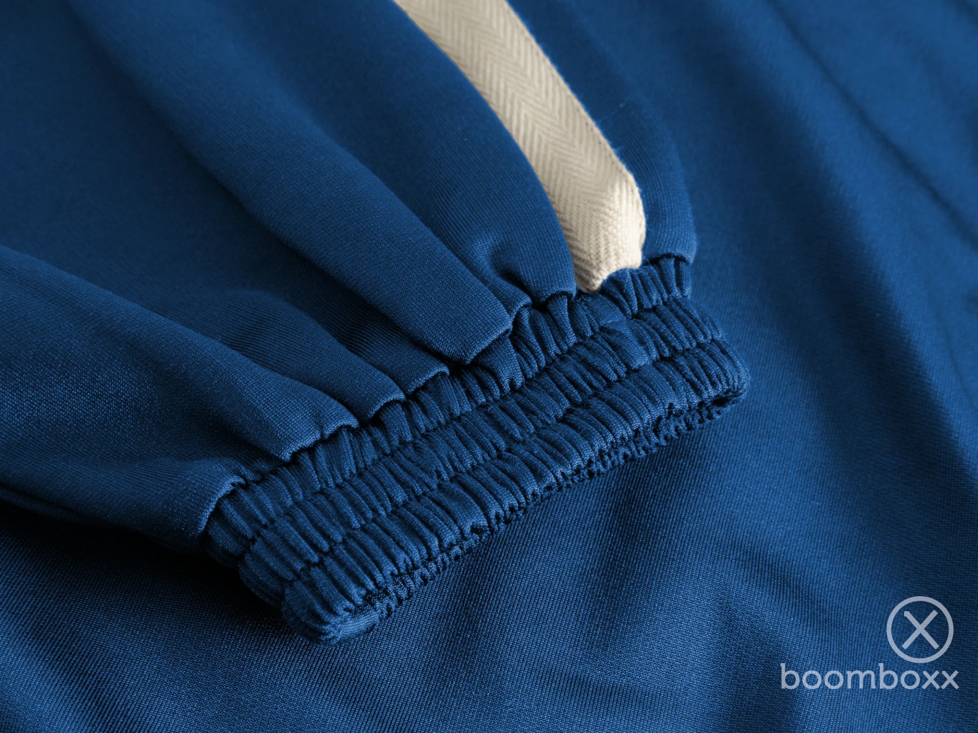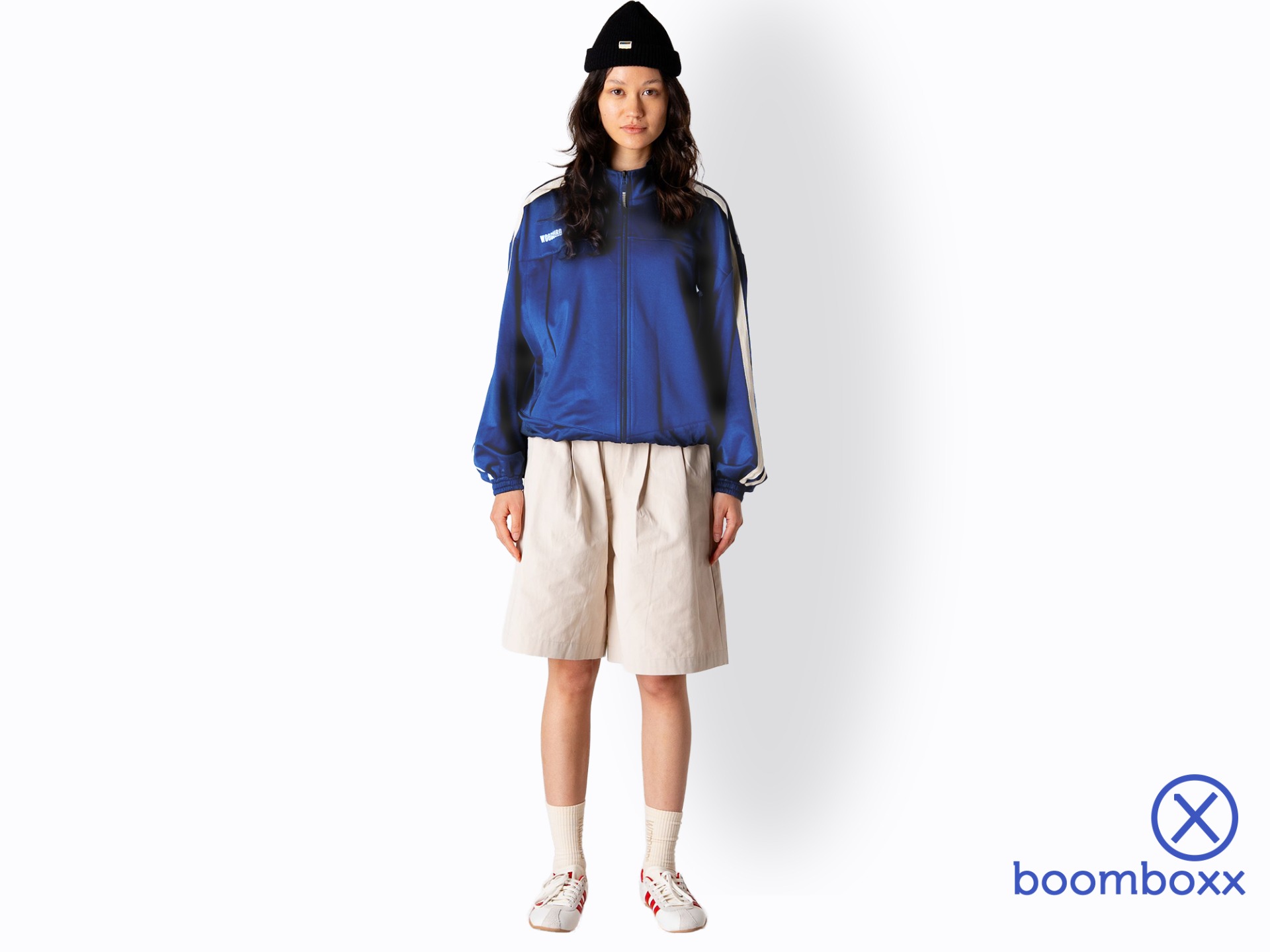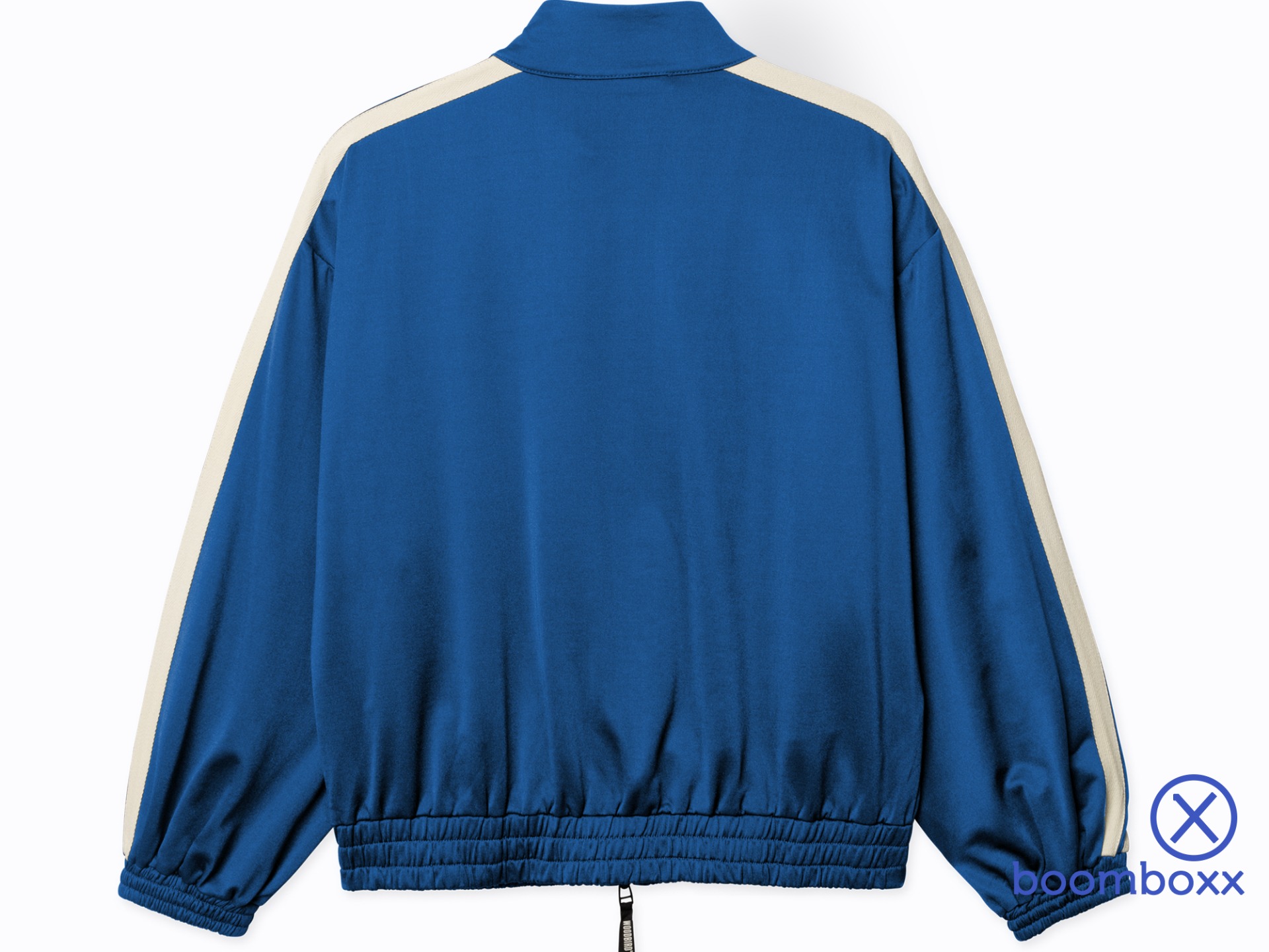 Woodbird WBPoke Track Pants Cobalt Blue. Ruimvallend trainingsjack met opstaande kraag en doorlopende ritssluiting. Glad oppervlak met contrasterende strepen op de mouwen. Afgewerkt met een elastische zoom en manchetten die de pasvorm lichtjes accentueren.