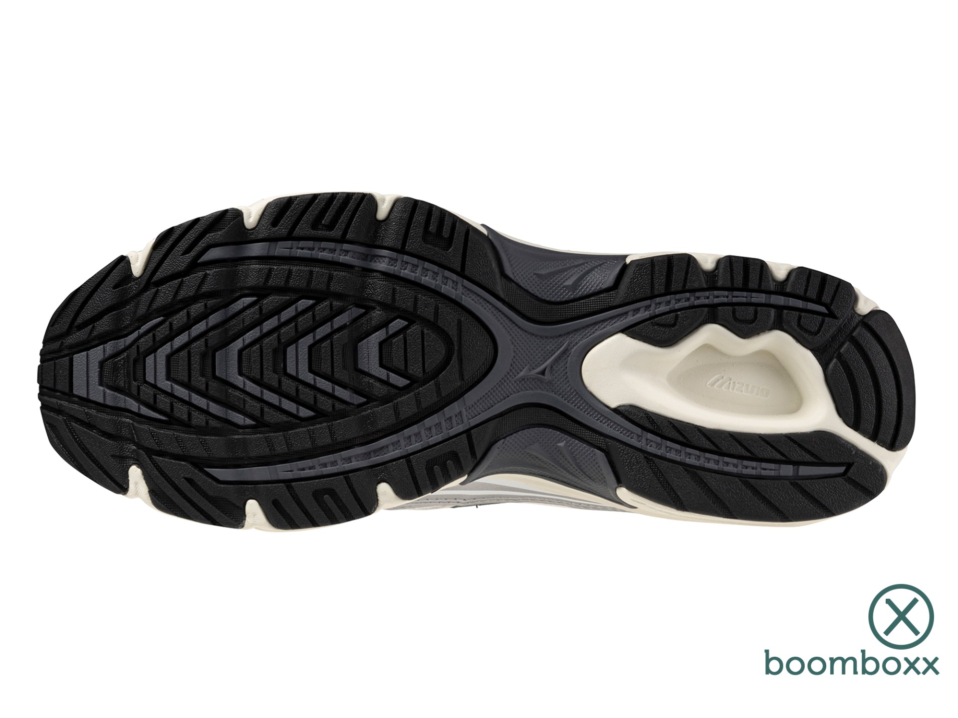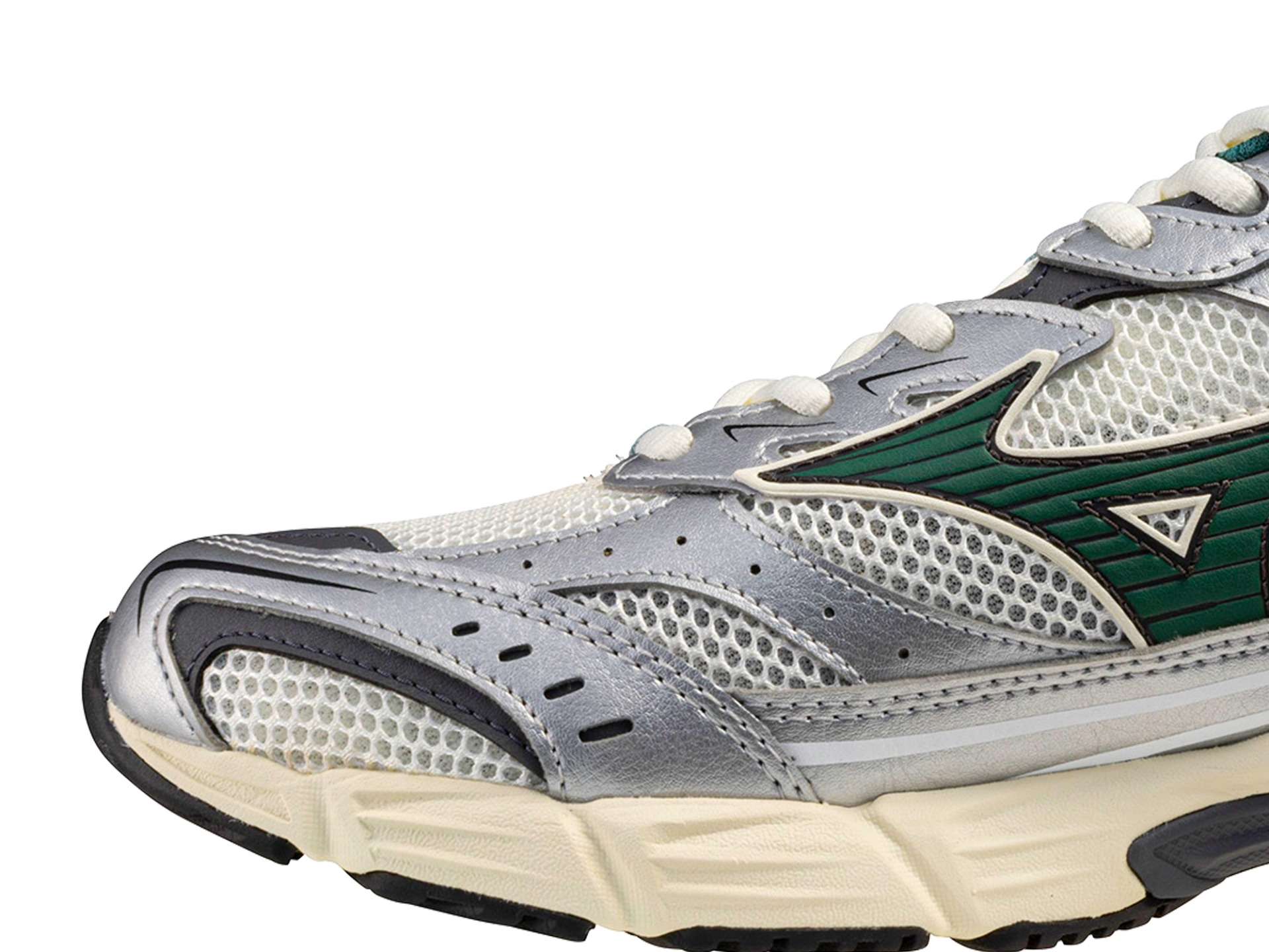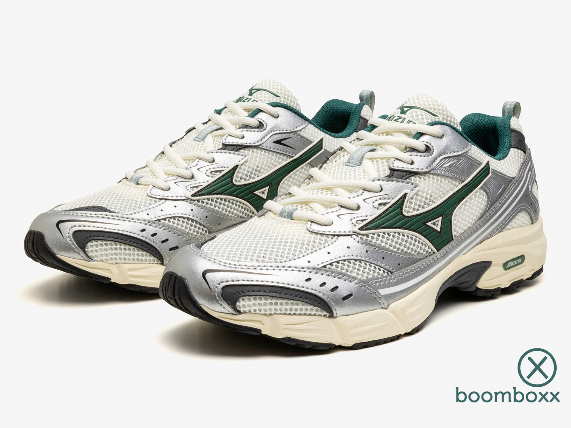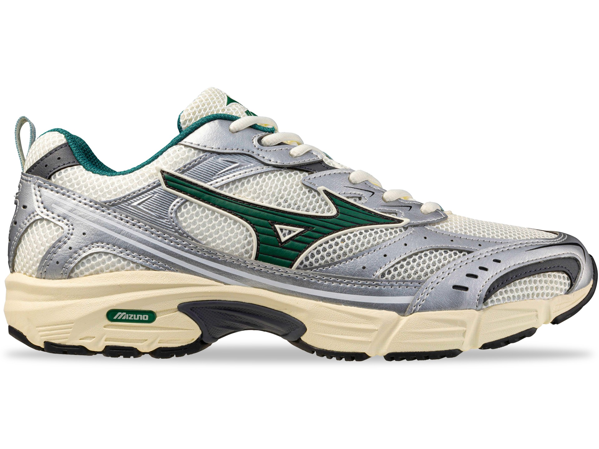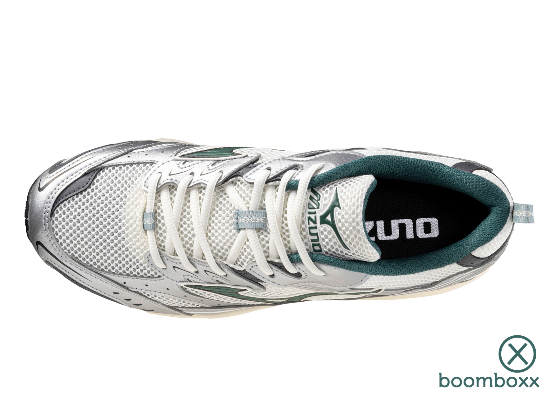 Mizuno MXR Snow White Bistro Green Silver. Het MXR bovenwerk is ontworpen met een jaren 2000 vibe, een combinatie van eenvoudige mesh en synthetisch suède leren delen, met overal accentdessins. De zool is gebaseerd op het ontwerp van die tijd, met een zachte, comfortabele tussenzool en all-over rubber.